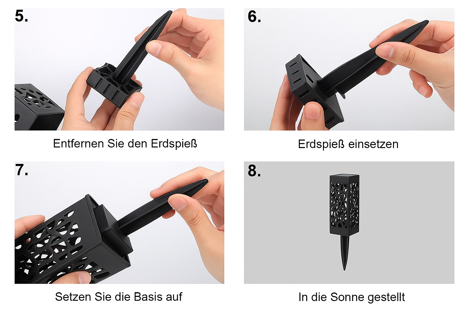 Einfach in die Erde stecken – fertig. Kein Kabel, keine Schrauben, kein Stress. Innerhalb einer Minute einsatzbereit.
